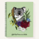 A cute koal bear on a tree limb with flowers and eucalyptus leaves in a backdrop of green