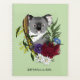 A cute koala bear in a tree branch with flowers and eucalyptus leaves in backdrop of green