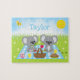 This cute and whimsical puzzle features adorable koala bears having a picnic on a blue gingham cloth with treats such as honey, watermelon, strawberry jam, lemonade and pie. In the background is a bright blue sky and sunshine, butterflies and daisies. This can be personalised with a name.
