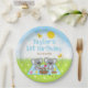 This cute and whimsical plate features adorable koala bears having a picnic on a blue gingham cloth with treats such as honey, watermelon, strawberry jam, lemonade and pie. In the background is a bright blue sky and sunshine, butterflies and daisies. The text combines decorative and serif fonts for a stylish and modern look. This is perfect for a spring or summer birthday party.
