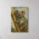 This serene wildlife art print captures a koala perched peacefully on a tree branch, its limbs gently gripping the bark as soft light filters through the forest canopy. The detailed fur texture and expressive gaze evoke a sense of quiet awareness, while the warm and cool tones of the background suggest a tranquil moment in nature’s embrace.
