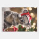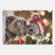 This image brings a festive Australian twist, with the koala in a Santa hat amidst Christmas presents and a soft bokeh glow.