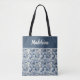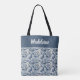 This Asian inspired blue and cream color tote bag features a vintage koi fish and water lily Chinoiserie pattern with your monogram name in white and light blue on dark slate blue at the top. Koi fish symbolize perseverance, strength, good fortune, and ambition, stemming from the legend of them swimming upstream to overcome adversity. Type your initials in the Personalize section to customize your bag.