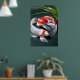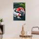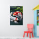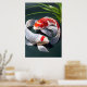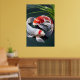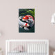 Poster of two koi fish with intricate patterns swimming gracefully side by side against a dark green background, highlighted by the presence of a few vibrant green plant leaves. The detailed scales and delicate fins of the koi create a serene and harmonious aquatic scene.