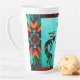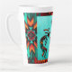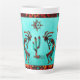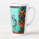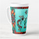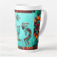 This is a Unique "One of a Kind" Southwest Kokopelli Latte Mug! It Features Two Southwest Kokopelli in Turquoise, Orange and Black Playing the Flute and Dancing Around a Cactus Under the Sun...on a Turquoise Background!