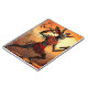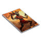 A Kokopelli holding a flute and dancing at the edge of a cliff that overlooks a vast desert Southwest canyon vista, silhouetted by the rising sun, with multitudes of birds flying in an orange sky.