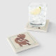 This is a stone coaster with original photo artwork of a kokopelli in rust with a turquoise outline.