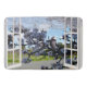 Pictured looking out through open windows are two Kookaburras in a blossom tree