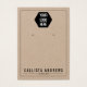 This earring display card features a simple black and white design. It depicts a pinstripe black border, a place to add your logo, and matching modern typography on top of a sandy beige kraft paper background. On the back, it includes contact information that can be changed completely or personalised to your details. It's a professional, elegant, and stylish way to display your product with pride. (earring holes are printed markers only, puncturing must be completed by the customer)