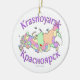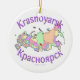 Colourful map ornament of the Russian Federation with Krasnoyarsk city location marked with a flag. City name also in Russian - Красноярск . Unique Russia family or adoption or Christmas gift for families with children from Krasnoyarsk. Designed by Hendrika of www.RedThreadMaps.com