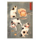 Kuniyoshi Four Cats print. Japanese Ukiyo-e from the Edo period. Utagawa Kuniyoshi was a master of multiple genres of woodblock printing and painting. Cats were a particular favourite of Kuniyoshi, and Four Cats in Different Positions is one of his most charming cat paintings. The work features four Japanese bobtail cats, one sitting, one sleeping, one playing, and the other waving its paw. A cute gift for fans of Kuniyoshi, Japanese art, and cat paintings.