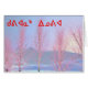 A digital painting of snow-covered birch trees; tinged pink by the setting sun. Inuktitut text reading "Kuvianak Innovia" (ᑯᕕᐊᓇᒃ+ᐃᓄᕕᐊ - Merry Christmas), in the syllabic alphabet adopted in Nunavut, also appears in red. The Inuit are commonly referred to as Eskimo, but that term is now disfavored as it is considered to be pejorative. Here in the north it is common to see snow-covered trees tinged either pink or orange by the sun hanging low on the horizon.
