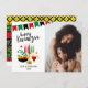 This fabulous photo Kwanzaa card with "Happy Kwanzaa!" in a modern script font in black, a Kinara grouping, your names and the year in a clean crisp traditional cap font and a lovely photo of you, your children or your family on the front and a coordinating black, red, yellow and green African pattern on the back is perfect for sending to all your family and friends. Everyone will love getting a new photo. To make this card your own, simply select Personalise this template, upload a favourite photo, and type in your names, and the year. It's that easy!