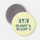 Magnet design with features latitude and longitude coordinates for Kyiv, Ukraine in distressed dark blue font .