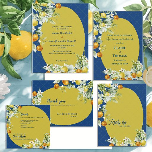 Featuring hand-painted watercolor lemons, oranges, and lush green leaves against a rich cobalt blue and golden background, this design captures the charm of Italian summers and coastal romance.