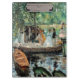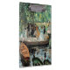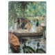 Pierre-Auguste Renoir. La Grenouillère . lovely landscape on the river in green tones. There are boats on the shore. In the middle ground, a group of people stands on a walkway under a spreading tree. In the background there are yazta and trees. Reproduction of famous works of art images in the public domain.
