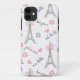 Cute pattern with the lovely eiffel tower drawing with a big pink ribbon on the top. Girly pink and grey flowers and small pink hearts everywhere. Written "Je t'aime", "bonjour", "ma belle" and "oh la la". Pink polka dots on the background.