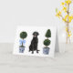 These greeting cards feature a watercolor portrait of a black lab sitting in between two chinoiserie style topiaries.