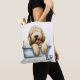 Cute dog watercolor illustration of a happy fluffy Labradoodle dog in a bathtub. Great for dog lovers.