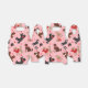 Cute Valentine's Day Labradoodle / Goldendoodle with in black, brown and tan coats wearing red, pink, and white polka dot and heart sweaters with scattered paw prints and arrow on a pink background.