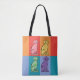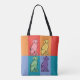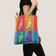 Dog lovers will enjoy the cute Labrador retriever illustration on this tote bag. The sweet dogs are decorated in pink, purple, yellow and green with colourful swirls, stripes, polka dots and spots, on a background of red, orange and blue colour blocks.