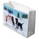 Labrador Christmas with Snowman gift bag.  Whimsical Labrador Retriever painting painted by  Naomi Ochiai from Japan.  Nice for dog lovers who love Labrador Retriever dogs.  Yellow Labrador and Chocolate Labrador and Black Labrador are all painted in the picture.  Three Labrador dogs are playing with their snowman in the white snow field.  Typical Christmas Holiday season scene.