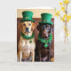 This greeting card features two Labrador retrievers dressed up for St. Patrick’s Day, posed close together as if sharing a quiet, friendly moment. A golden Lab on the left wears a tall emerald top hat with a gold buckle, its shiny coat catching the warm light. Around its neck sits a leafy green garland with a single shamrock charm, adding a sweet touch of closeness between the pair ☘️. Beside it, a chocolate Lab mirrors the pose in a matching green hat, its darker fur creating a rich contrast against the greens. Its neckpiece is a green wreath threaded with a strand of pearls, ending in another shamrock charm that feels like a small gift between friends 💚. Both dogs look straight out with steady, gentle eyes, framed by a softly blurred background of wooden wainscoting that keeps the focus on their faces and outfits. The greeting “Happy St. Patrick’s Day” appears near the top in green lettering, with a smaller line of text in gold placed beneath it, and the hats’ crisp edges and layered garlands stand out against the warm brown backdrop.