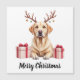 "This beautiful illustration features a detailed portrait of a loving Yellow Labrador Retriever with its characteristic broad head, gentle expression, and smooth golden coat. The dog is given a charming holiday touch with reindeer antlers adorned with small golden and green/blue ornaments. Two beautifully wrapped Christmas presents with red ribbons sit prominently on either side. This high-quality graphic is ideal for personalized holiday gifts for Lab owners, Christmas cards, apparel, ornaments, or any product celebrating this friendly and devoted dog breed."