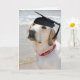 Labrador retriever with black graduation cap and red collar on the beach for 2025 graduate.