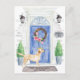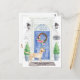 Announce your new address with our stylish announcement featuring a Labrador Retriever, blue front door, welcome mat, slate sign, topiaries and a floral wreath set on a grey brick background.