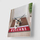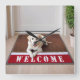 Blonde Labrador Retriever dog on a red and brown mat with welcome text by front door.
