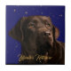 Anyone who has lost their heart to a regal Labrador Retriever Dog will love this tile! It features a gorgeous chocolate coloured Labrador Retriever looking up against a blue night sky filled with gold stars. The bottom has custom text in gold script that says "Labrador Retriever". You may customise the text, or even remove it if you prefer.