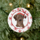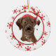 On the front of this Holiday ornament is a beautiful watercolor image of a chocolate Labrador Retriever wearing a red and white striped Santa hat. The image is placed on a red oval framed by a retro red snowflake pattern on a white border. The back of the ornament has the same background and oval with your custom text in white on a matching red background. Beautiful, especially for someone who loves a Lab!