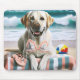 A Labrador retriever playfully holds a bikini top in its mouth while lounging on a beach towel