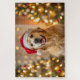 Fluffy golden retriever wearing a red Santa hat. The room with bokeh from the twinkling Christmas lights in the background.