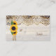 Elegant white lace, ribbon, sunflowers and wood wedding seating place card featuring white lace on brown wood with two crossed satin ribbons and sunflowers. Text in brown. Note that lace, wood and sunflowers are all “printed on” and not real fabric or flowers. This elegant, sophisticated and romantic design with a rustic essence is part of a wedding set and is perfect for a country chic or western fall/autumn wedding with a neutral colour palette.