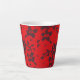 Colour photograph of black lace with red background.