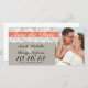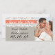 This classic wedding save the date card features a grey background and imagery of coral coloured ribbon overlaid on lace-look trim. Perfect for a rustic or vintage inspired wedding. Add your own photo to customise. Contact us for custom colours at no additional cost.