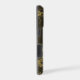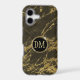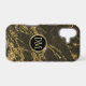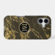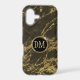 This elegant phone case features your two letter monogram in gold at the centre of a black circle banner that is double framed in gold. The banner is placed on an abstract gold faux glitter laced black background. A few white star shines give it extra glow.