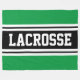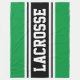 This sporty, athletic design features bold LACROSSE text inside a highlighted wide black stripe with double white racing stripes against bright green outer stripes. The text and colours in this design can be personalised.