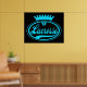 Lacrosse is King. Cool, retro-style signage design. Oval with cursive lettering of the word lacrosse with lacrosse stick symbol within. Adorned with vintage crown. Lacrosse vintage style poster print. Version: black and cyan blue.