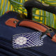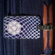 Lacrosse gear bag or luggage tag featuring lax mesh and ball design on navy blue background.
