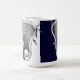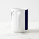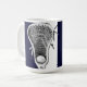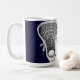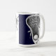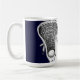 Creative lacrosse mug featuring lax stick design on a navy blue background.