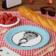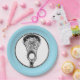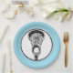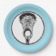 Lacrosse party or game day event plates featuring lax stick art on blue background.