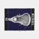 Lacrosse player keepsake gift featuring lax stick-and-ball design on navy-blue background. Edit text to add player's name and team number #.