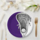 Creative lacrosse team party plates featuring cool lax stick and lacrosse ball art on purple background.