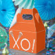 Creative lacrosse party or team sports event favour boxes featuring lax sticks design on orange background.