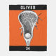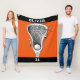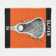 Lacrosse player or coach blanket featuring stick-and-ball design on orange background. To personalise edit text to add lax player's name and team number #.