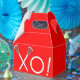 Creative lacrosse party or team sports event favour boxes featuring lax sticks design on red background.
