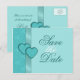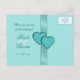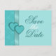 A faux satin turquoise ribbon delineate between a lovely tone on tone turquoise damask pattern and a solid light blue-green on the front of this romantic save the date announcement postcard. Two love hearts in the same damask and trimmed in dark blue-green lace accent the ribbon. All customisable text can easily be changed to suit your own needs.